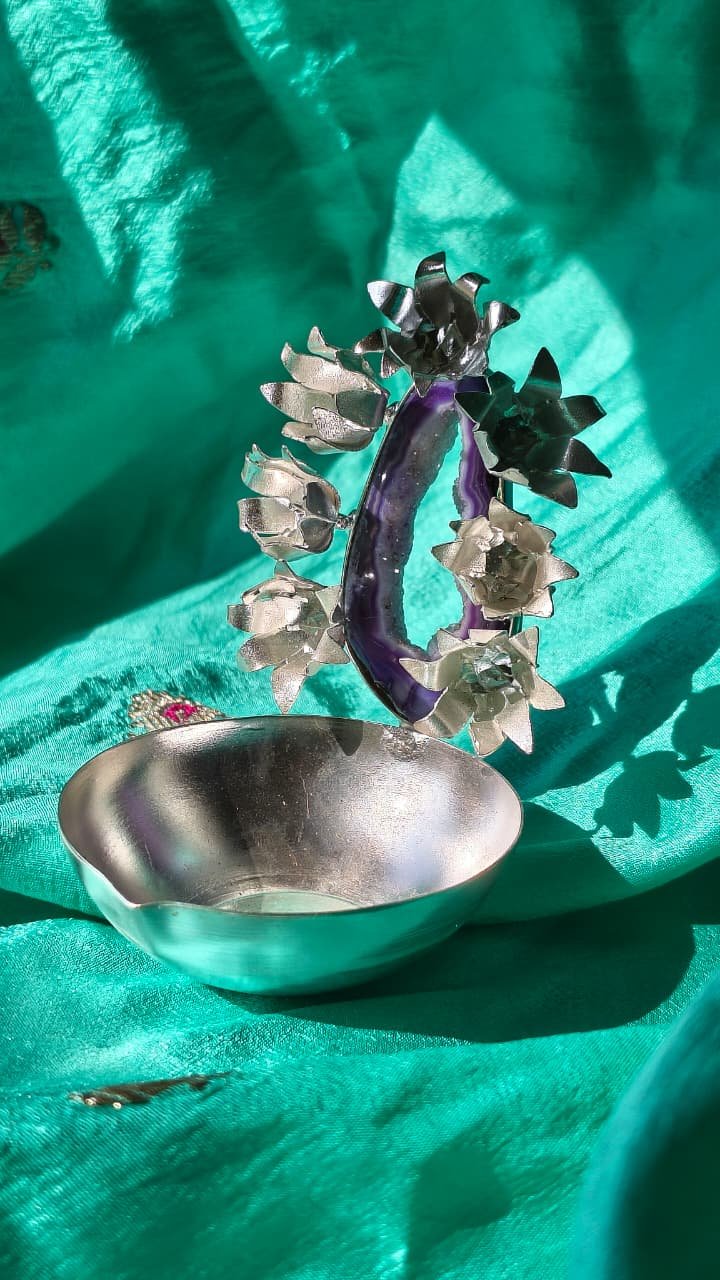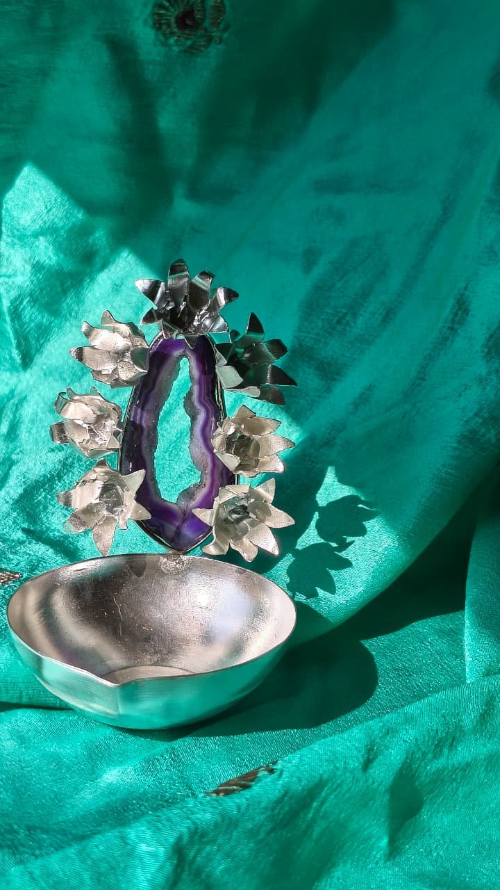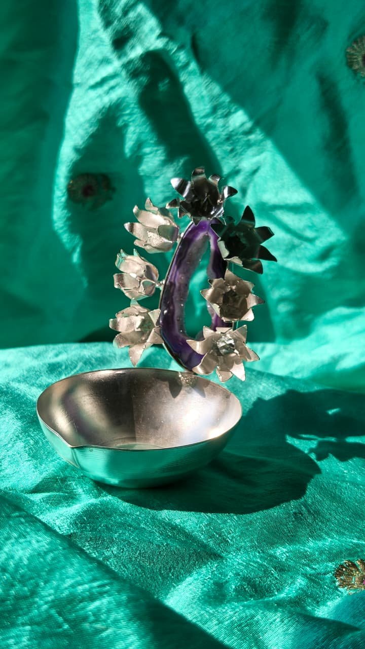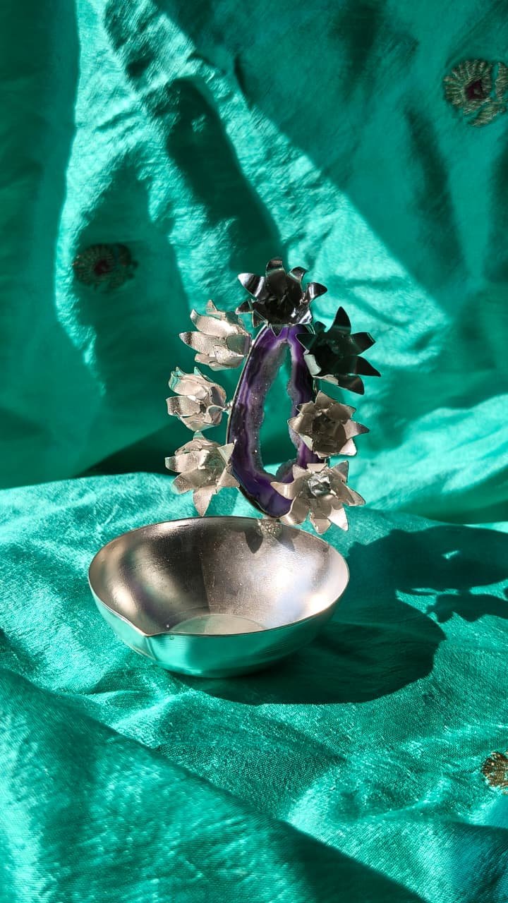 Elevate your sacred space and amplify your spiritual practice with this truly unique Real Silver Plated Gemstone Diya. The timeless elegance of silver with the powerful energy of crystal, this piece is designed to transform your daily rituals into moments of deep realignment.