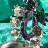 Unique Floral Design: An arching sculptural element rises from the bowl, adorned with delicate, multi-petaled metallic flowers, creating a visually striking and devotional focal point.